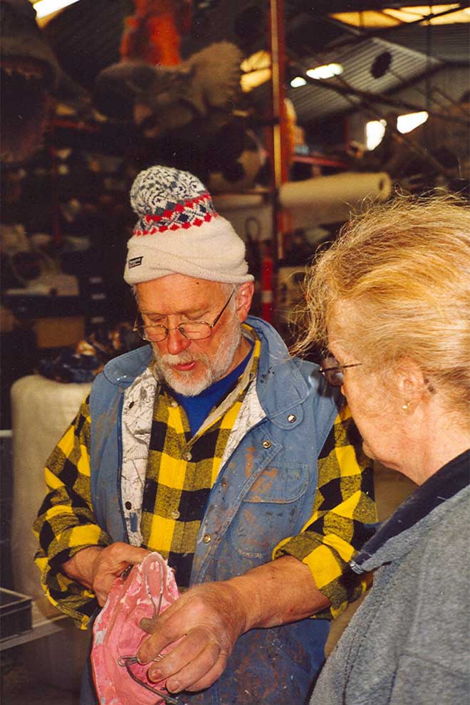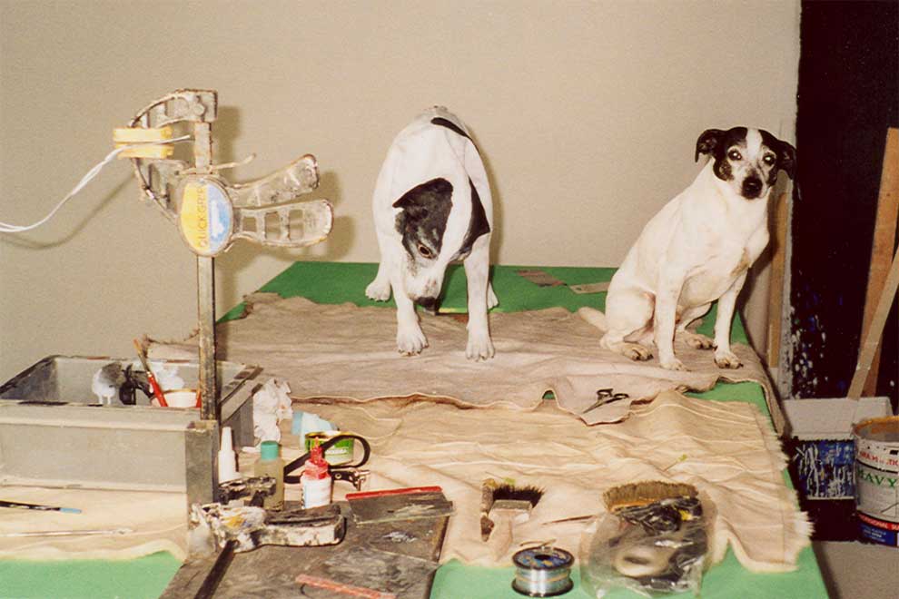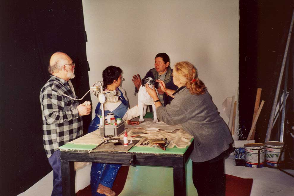 In the story Rasmus has to pull his head and legs into his just like a turtle under its shell. Since this is not physically possible for a dog, it was necessary to make an exact copy of Rasmus which could do this stunt. The pictures below are from the company that made the model and where Rasmus had to stand model several times.
